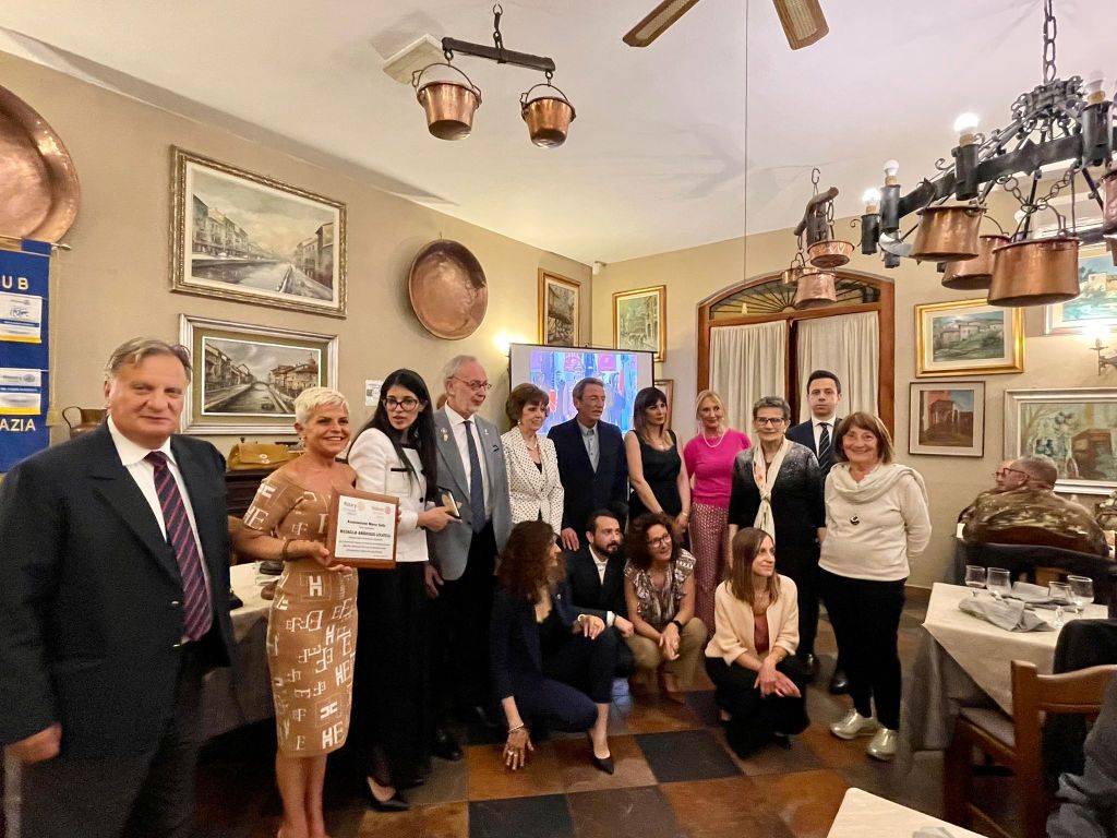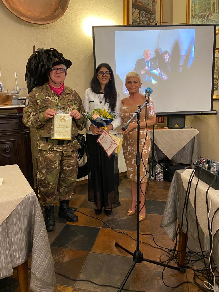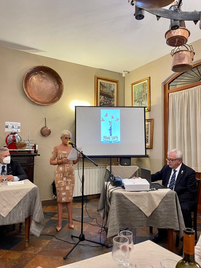 E con altrettanto piacere mi pregio di comunicare che per l’anno rotariano 2021-2022 la medaglia internazionale è conferita all’Associazione “Mama Sofia” e consegnata alla Presidente e Fondatrice signora Zakia Seddiki per il perseverante impegno nel salvare la vita ai bambini di strada della Repubblica Democratica del Congo. Associazione che la vedeva già impegnata unitamente a suo marito Ambasciatore Italiano in Congo Dott. Luca Attanasio, barbaramente ucciso in un attacco armato insieme al Carabiniere che viaggiava con lui, su un convoglio del Programma Alimentare Mondiale dell’ONU.