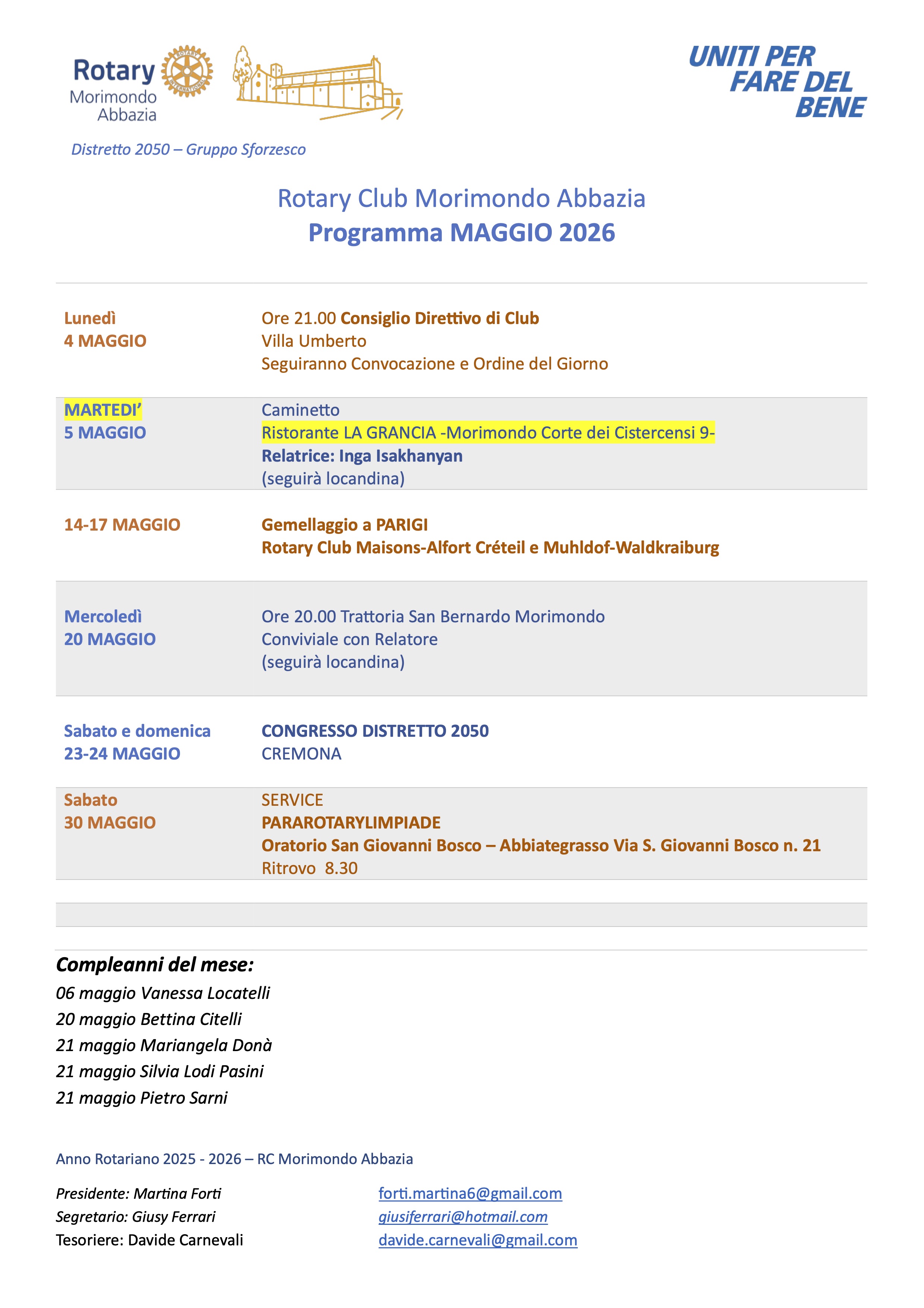 La serata conviviale “Parliamo Fra Noi”, tenutasi lo scorso 22 aprile, ha rappresentato un importante momento di incontro e condivisione tra il Rotary Club Morimondo Abbazia e il Rotaract Club Morimondo Abbazia. L’evento si è svolto in un clima di collaborazione e partecipazione attiva, testimoniando il forte legame tra le due realtà. Durante l’incontro sono stati presentati i risultati dei più recenti service, evidenziando l’impegno concreto dei club sul territorio. Ampio spazio è stato dedicato anche ad alcune tematiche organizzative, fondamentali per migliorare l’efficacia delle attività future.